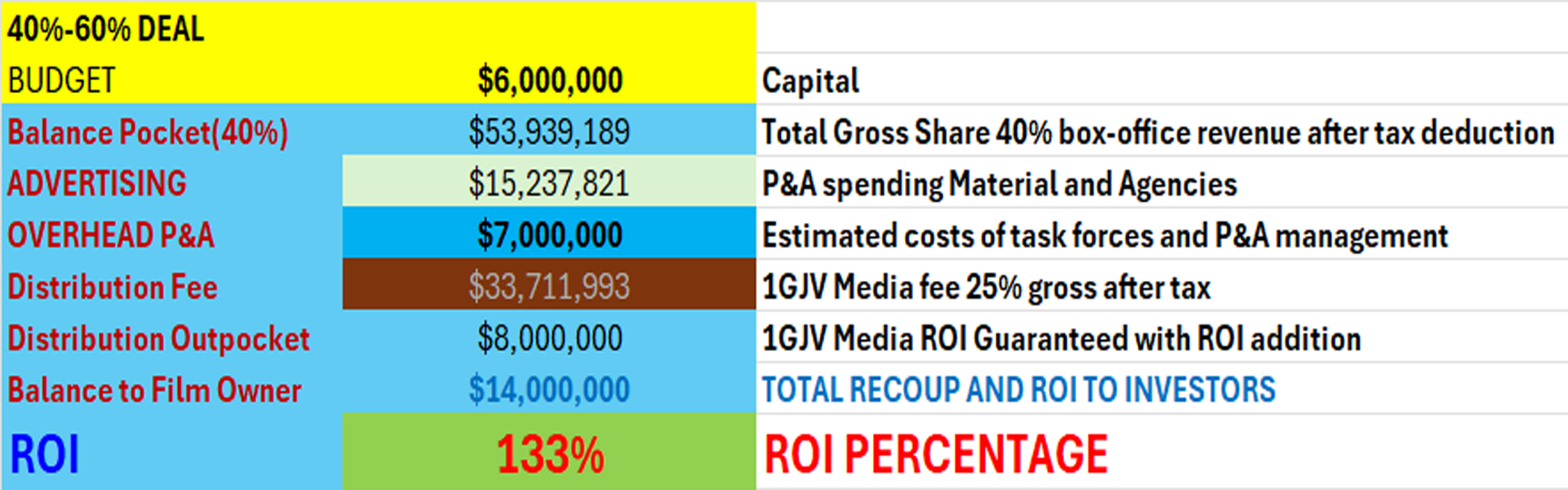 Important Note: 1GJV Media Inc. has implemented a strategy designed to achieve the minimum box office revenue required to meet guaranteed return on investments.